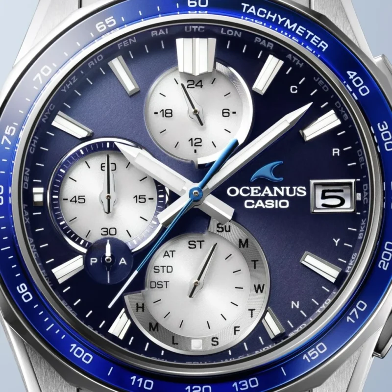 OCW-S7000F-2A, koyu mavi ana kadranı canlı beyaz alt kadranlarla birleştirerek iki tonlu bir estetik sunuyor. Casio, parlaklığı ve renk netliğini artırmak için alt kadranlara yüksek opaklıkta beyaz buhar biriktirme uygularken; ana kadran ve çerçeveye uygulanan mavi buhar biriktirme, zengin, okyanus esintili bir görünüm yaratıyor. Kadran, beyaz takimetre işaretlerine sahip safir cam çerçeve halkasıyla çevrelenmiş olup, zarif ve parlak bir dokunuş katan çok yönlü titanyum bir taban üzerine yerleştirilmiştir.