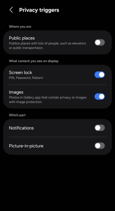 İlk seçenek olarak Otomatik Gizlilik ortaya çıkıyor. Hassas bilgiler içeren uygulamaları kullandığınızda ve kalabalık yerlerde Özel EKran otomatik olarak açılır. İkinci seçenek olan Maksimum Gizlilik ise içeriğin görünmemesi için ekran parkalıkğını daimi olarak azaltır. Son olarak Özel Koşullar olarak adlandırılan bir seçenekte mevcut. Bu ayarın gizlilik ekranı için hangi koşul ve zaman aralığında açılmasını ayarlamak üzerine olduğu varsayımı yapılıyor.