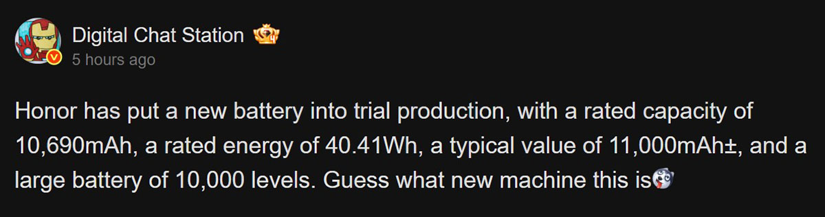 DigitalChatStation’ın ortaya çıkardığı bilgilere göre Honor, yakında piyasaya sürülecek akıllı telefon ürünlerinden biri için 11.000 mAh’lik bir bataryanın deneme üretimine başladı. Üretici firma konuyla ilgili henüz resmî açıklama yapmazken kulislerde konuşulan bilgilerin güvenilirliği ile yakında bu yeni pilin görüntüsü ortaya çıkabilir.