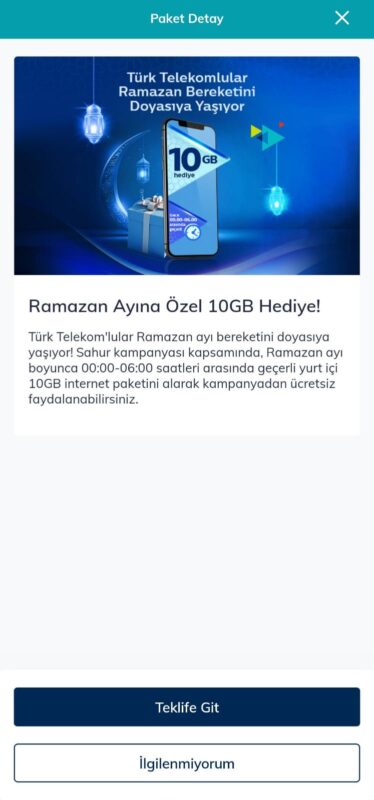 İlk olarak faturalı/faturasız TT Mobil hattınızın olması yeterli oluyor. Sonrasında Ramazan ayında geçerli Sahur 10 GB içi adım adım paket tanımlama işlemini aşağıdaki sıralamayı takip ederek yapabilirsiniz. Türk Telekom uygulamasından mobil hesabınıza giriş yaptığınızda en altta çıkan tanıtım yazısına tıklayarak aşağıdaki görseldeki gibi ekrana erişeceksiniz. Teklife git diyerek devam edin.