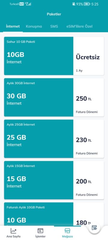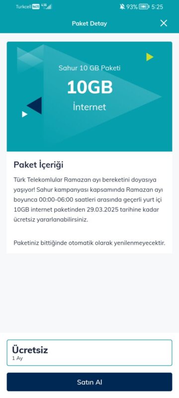 Ardından aşağıdaki gibi Paketler menüsüne geçiş yapmış olacaksınız. En üstte yer alan Sahur 10 GB paketini görüyor olacaksınız. Ücretsiz yazan pakete tıklayın ve devam edin.