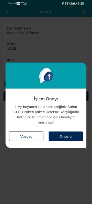 İşlem onayı adında ufak bir pencere açılacak. Paket içeriği ve süresi konusunda aynı zamanda ücretsiz olduğu ifadesiyle sizlere vazgeç veya Onayla yapabilmeniz için seçenek sunulacak. Paketi tanımlamak için onayla diyerek talebinizi iletebilirsiniz.