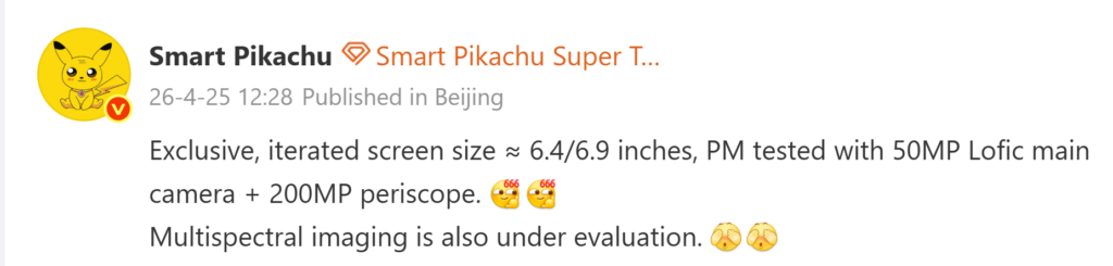 Son zamanlarda ortaya çıkan bir sızıntı, yakında piyasaya sürülecek vivo X500 serisi modellerinin ekran boyutlarını gözler önüne serdi . Serinin kompakt ve büyük boyutlu bir amiral gemisi içermesi beklenirken, markanın 6,59 inçlik bir ekrana sahip orta boyutlu bir amiral gemisi eklemeyi de düşündüğü söyleniyor. Yeni bir sızıntıda, bilgi kaynağı Smart Pikachu, vivo X500 Pro Max olduğu düşünülen model hakkında detaylar paylaştı.